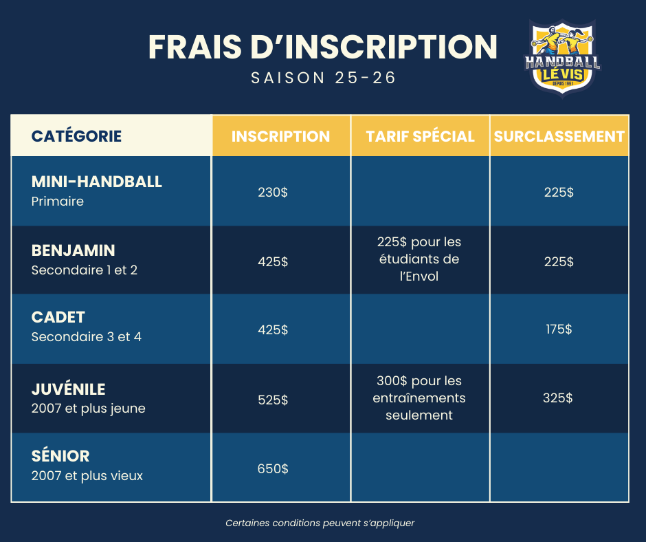 Les inscriptions au Club de Handball de Lévis se fait directement sur le site Qidigo. Toutes les formalités administratives et le paiement sont à faire en suivant le lien de votre catégorie, ci-dessous. Chaque catégorie présentée ci-dessous est ensuite découpée entre les différentes écoles et/ou par sexe. Vous n’avez qu’à sélectionner la sous-catégorie qui vous concerne, créer un compte et remplir les informations demandées. Vous pouvez nous contacter (via notre page contact) si vous avez besoin de plus de renseignements ou d’aide à l’utilisation de qidigo.
